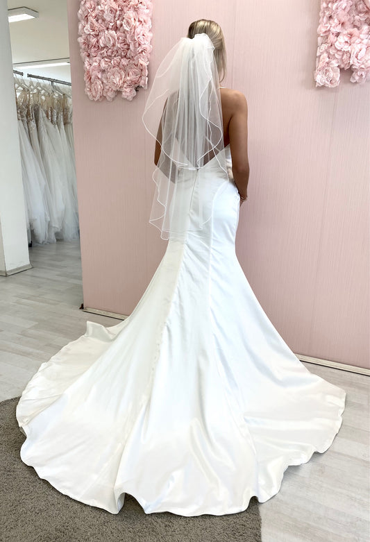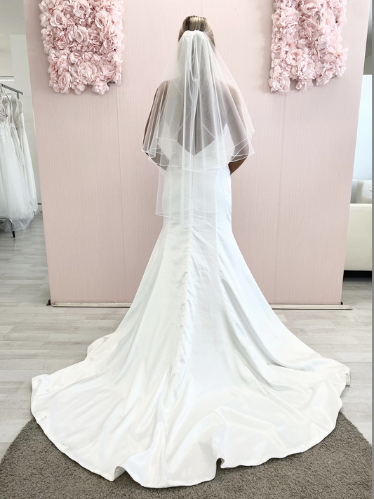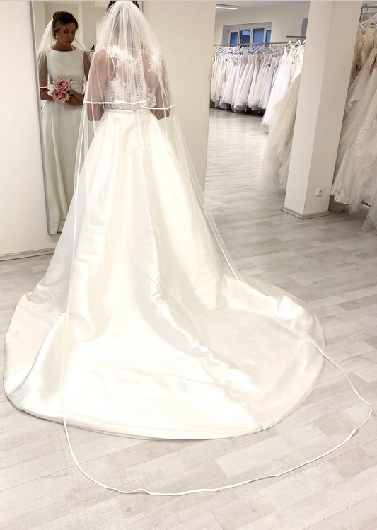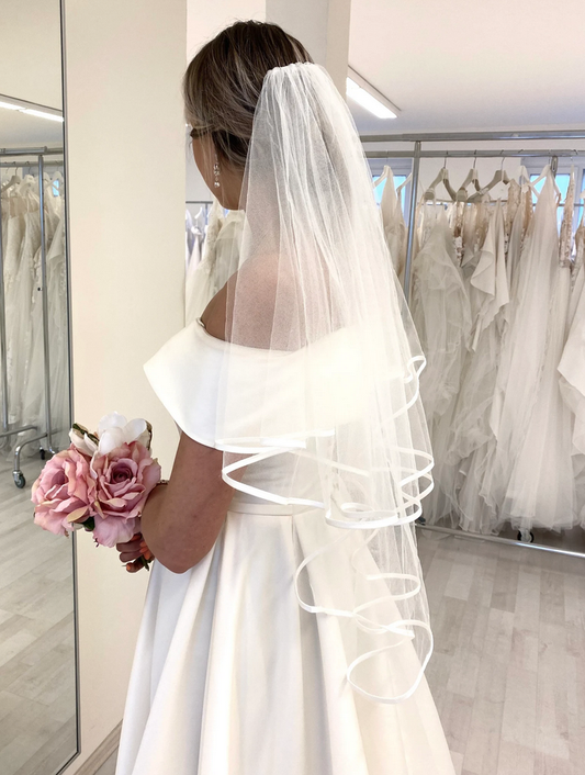 Satin-Hochzeitsschleier, mittelhüftlang Zweireihiger Hochzeitsschleier mit Satinkante