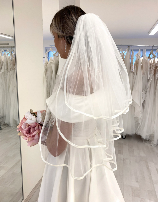 Satin-Hochzeitsschleier, Taillenlänge Dreistufiger Hochzeitsschleier mit Satinrand